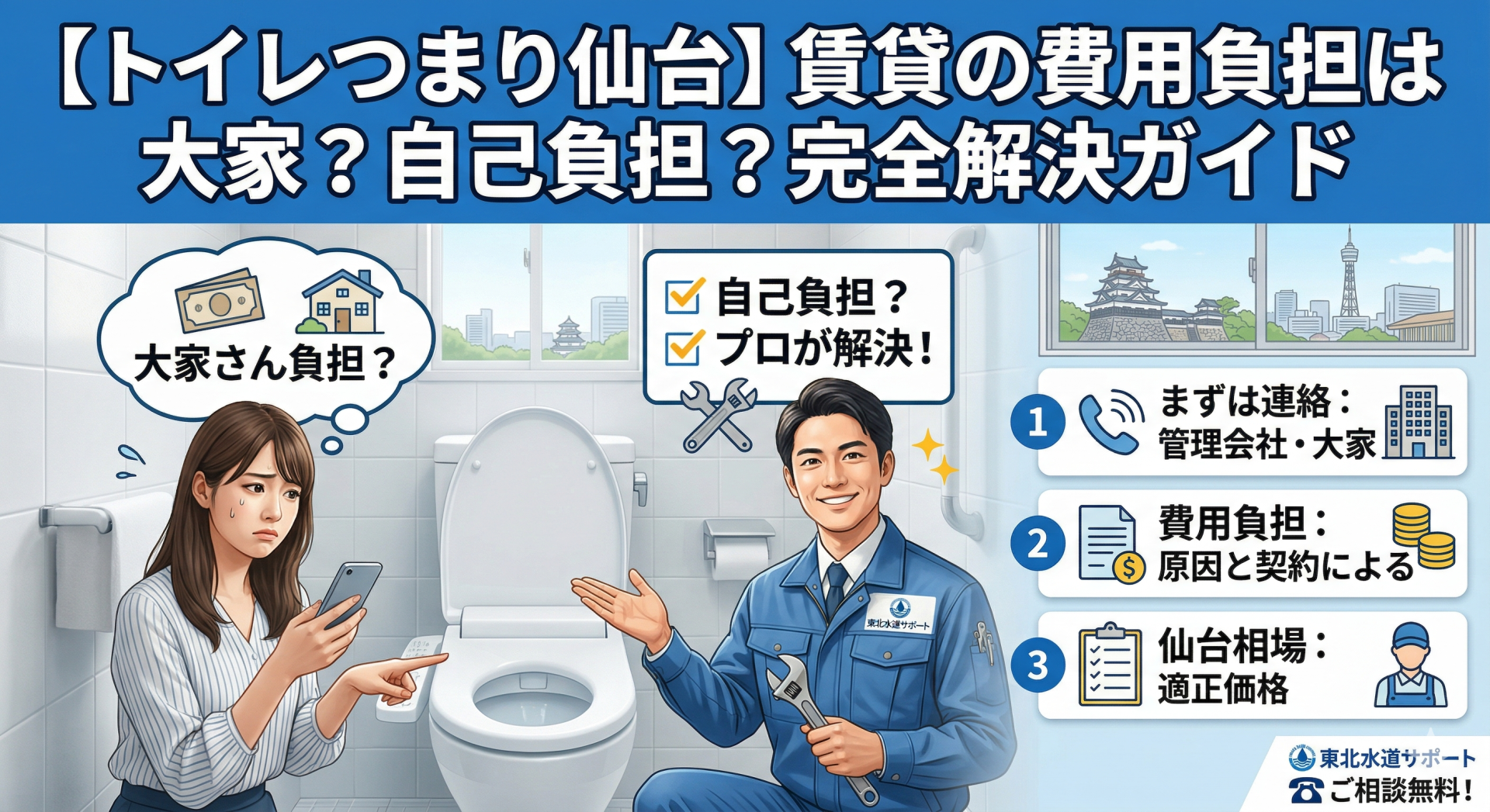 賃貸物件での急なトイレトラブルで不安な時は、一人で悩まずに、まずは無料見積もりの「東北水道サポート」までお気軽にお電話ください。